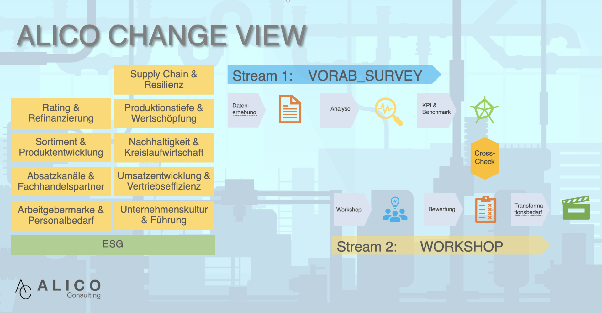 The ALICO ChangeView consists of a structured preliminary data collection that is compared with industry-relevant benchmarks, as well as an interactive management workshop to discuss the results and derive priority measures.